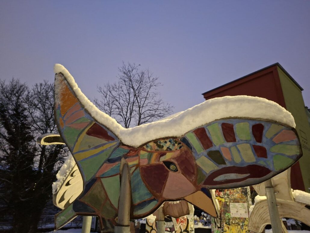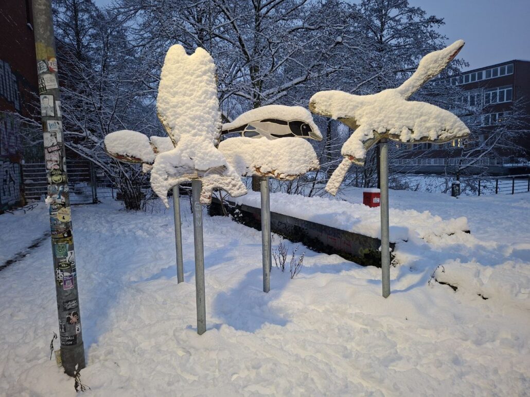 Diesen schönen Anblick wollten wir euch nicht vorenthalten: Die von den Kindern selbst getöpferten FLeKS-Vögel, dick eingepudert vom Schnee ❄️🐦
