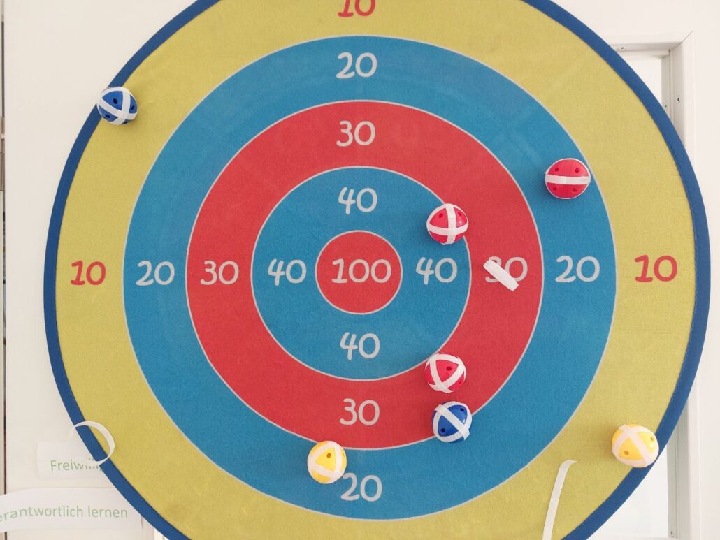 Im Gespräch reflektieren die Kinder und Jugendlichen, wie es ihnen aktuell beim Lernen und im sozialen Miteinander an der FLeKS geht. Sie schauen, welche Ziele sie erreicht haben, und formulieren neue Ziele für das kommende Halbjahr. Um diese verbindlich zu machen, nutzen wir eine Zielscheibe, auf die die Schülys ihre Ziele „werfen“ (siehe Bild 3).